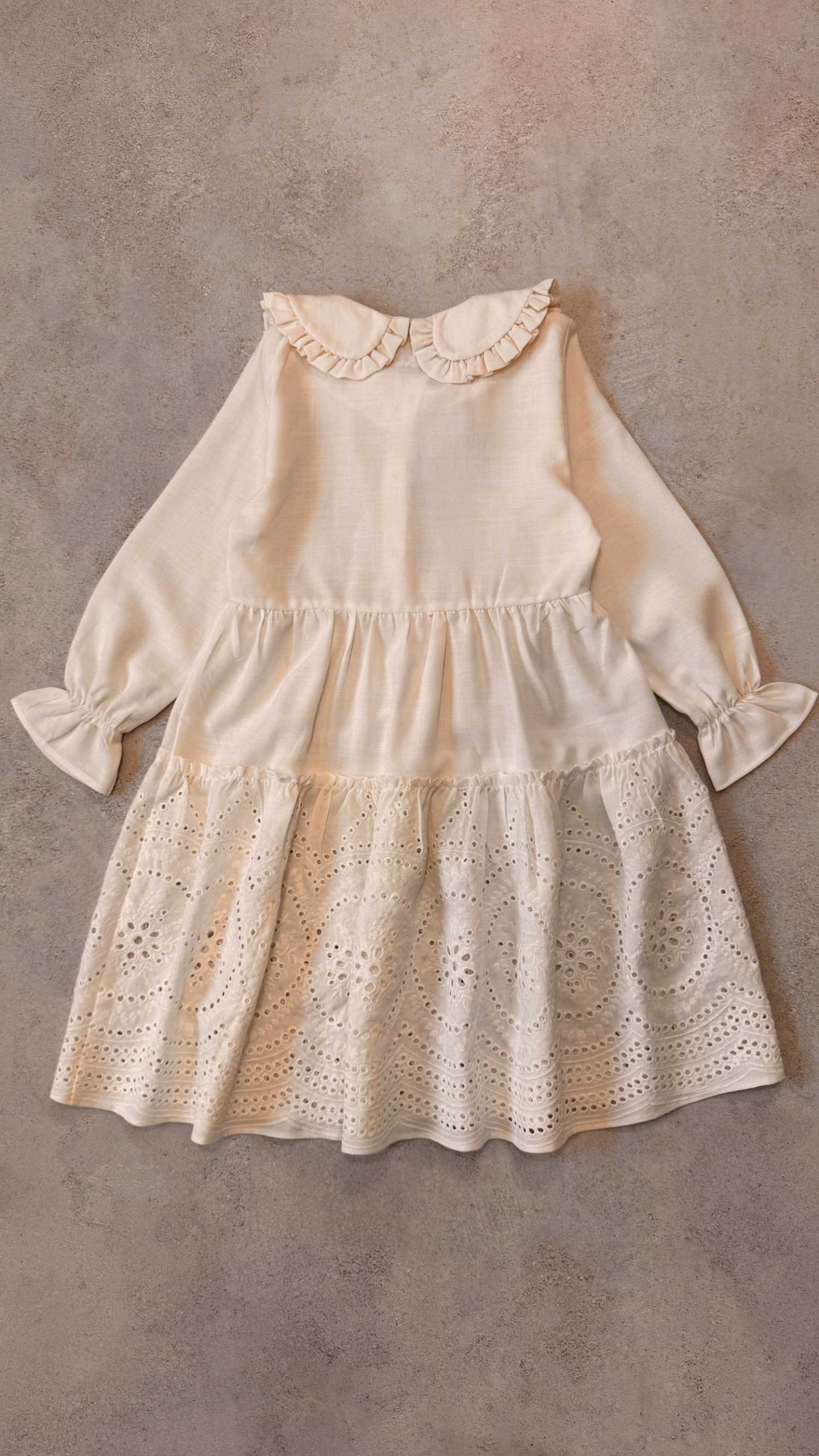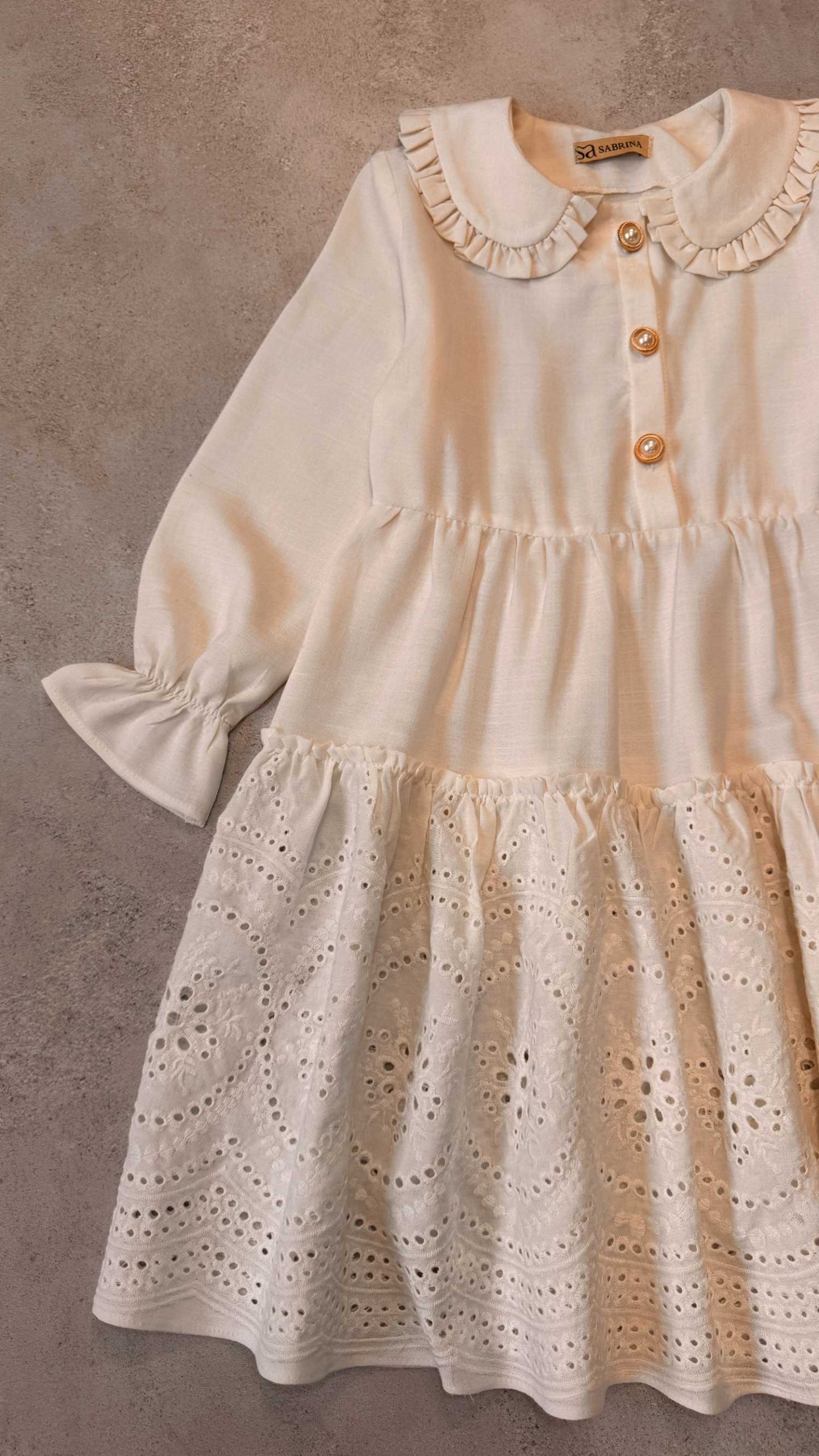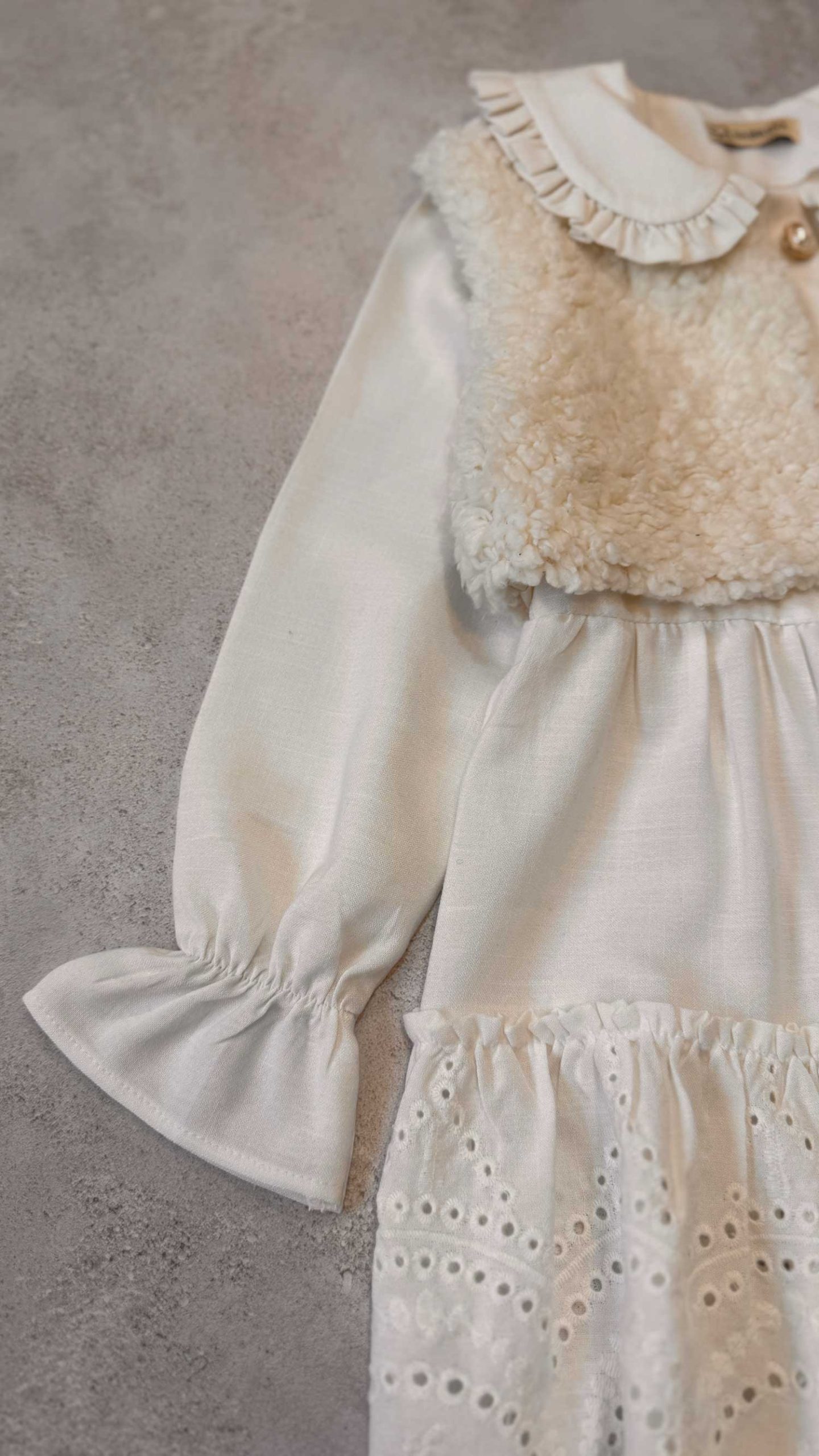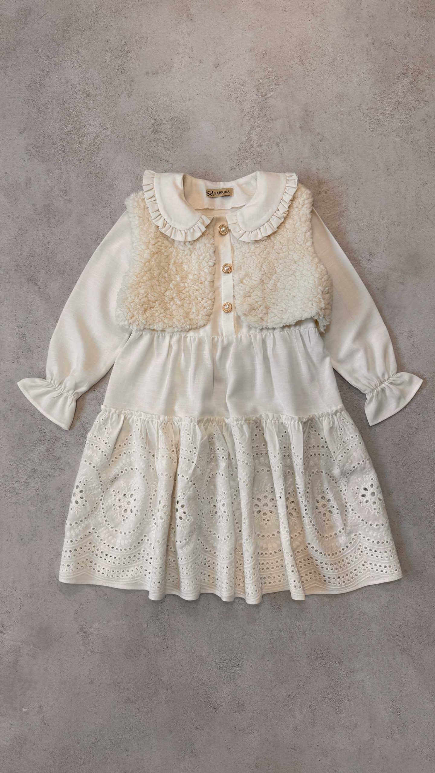 یقه ب ب، دامن چین دار، مچ کش، جلو بالا تنه دکمه خور، جلیقه تدی استر دارد.